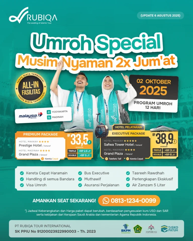 Ingin merasakan keistimewaan melaksanakan ibadah umroh dua kali hari Jumat dalam satu perjalanan? Paket Umroh bulan Oktober Special 2x jumat 2025 dari Rubiqa hadir sebagai pilihan terbaik untuk Anda.  Menawarkan pengalaman spiritual yang lebih istimewa. Paket ini dirancang khusus agar jamaah bisa menjalani dua kali salat Jumat langsung di Masjidil Haram, sebuah momen yang sangat langka dan penuh keberkahan.