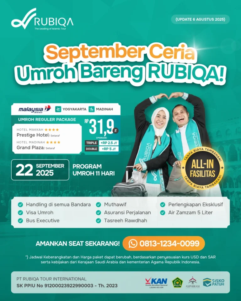 Ingin merasakan keistimewaan melaksanakan ibadah umroh dengan bonus kereta cepat? Umroh Bulan September 2025 dari Rubiqa hadir sebagai pilihan terbaik untuk Anda. Menawarkan pengalaman spiritual yang lebih istimewa. Paket ini dirancang khusus agar jamaah bisa menjalani dua kali salat Jumat langsung di Masjidil Haram, sebuah momen yang sangat langka dan penuh keberkahan.